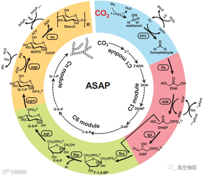原文中的图一很简洁地告诉了读者他们做了什么。上图是我从作者的原文中复制的图片。我认为作者已经通过这张图片非常清晰地告诉了大家他们团队真正解决了什么问题。作者用四种不同的颜色凸显了他们这项工作分为了4个模块(如外圈所示)。每个模块具体分成了哪些步骤,及这项步骤分别属于哪些程序都被清晰告知(如外圈中的每个箭头和内圈的注释所示)。如果细心一点,可以仔细观察外圈的箭头。你会发现除了第一步,由二氧化碳(CO2)到甲醇(CH3OH, methanol)是虚线箭头以外,其余箭头都是实心箭头。而事实上,作者也是通过实心箭头和虚线箭头告诉了读者,他们真正解决的科学问题是后面的实心箭头对应的步骤。换句话说,从二氧化碳到甲醇,这一步使用的方法仍然是化学方法。从甲醇到淀粉,使用了合成生物学方法!