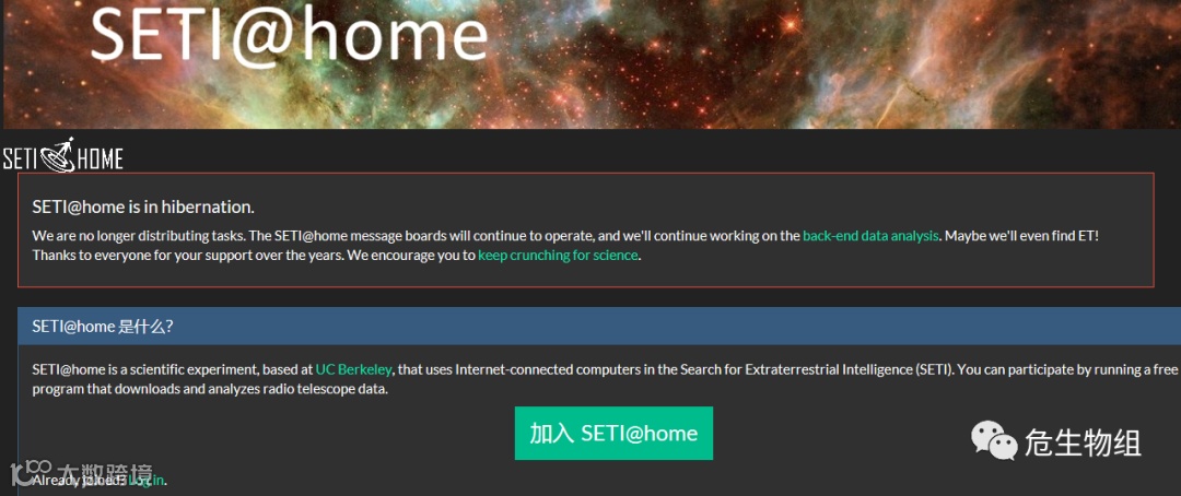 在科学研究中经常会遇到大数据分析情景。例如在生物信息学领域,处理高通量测序数据属于大数据分析的一种方式。但是如果我们拓展视野,拔高视角,大多数生物信息学的高通量数据处理所需要的计算资源其实是非常小的。一般情况下,500G内存服务器加上100万小时CPU运行时长,基本可以完成90%以上生物信息学数据分析。但是在其他领域,如天体物理学、统计物理学涉及的计算资源相当大。例如美国在上个世纪提出的SETI(Search for Extraterrestrial Intelligence)搜索地外智慧文明项目,该项目尝试通过Arecibo射电望远镜采集宇宙中的窄带无线电信号。因为宇宙中存在大量的信号,但是某些具有规律性且功率超出一定阈值的信号不太可能是自然产生,如果能接收到这些信号可以证明存在外星文明。该项目初期通过使用超级计算机来分析Arecibo望远镜产出的数据。但是一段时间后,科学家发现如果仅仅使用超级计算机处理这些数据那么需要耗费大量的时间,于是1995年David Gedye提出能否使用全球互联网中的各种闲置计算资源以形成超大型分布式超算,以此加速数据分析。用通俗的话来说,David试图号召地球上拥有个人电脑且连接了互联网的用户利用他们自己手里的电脑在闲暇时间提供一定的计算资源处理信号数据。尽管每个人的计算资源有限,但是数千万人甚至数亿人的计算资源整合远远超过了超算。因此加州大学伯克利分校创造了SETI@home社区,用户可以从https://setiathome.berkeley.edu/网站下载计算所需要的程序,闲暇时间运行程序即可参与地外智慧生命搜索项目。
