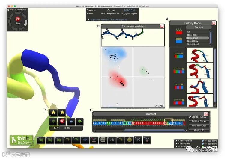 这款游戏通过教程展示了什么样的蛋白质才是稳定的。游戏利用一堆几何形状的物体来代表蛋白质结构,有主链和侧链,还有程序自动检测蛋白质稳定性,玩家首先需要通过拖动这些蛋白质链条,使其稳定性增加,最后处于一个稳定的状态。其次,玩家通过鼠标点击,拼接不同的组件来搭建一个可能存在的蛋白质,游戏会自动通过一个算法来判断这个蛋白质结构是否正确,并且给出一个分数。当分数达到或超过一定标准后玩家可以开始下一关游戏。最重要的是Foldit的玩法非常简单,仅需鼠标操作,且几乎不需要生物学知识,通过通关的方法极大增加了游戏趣味性。