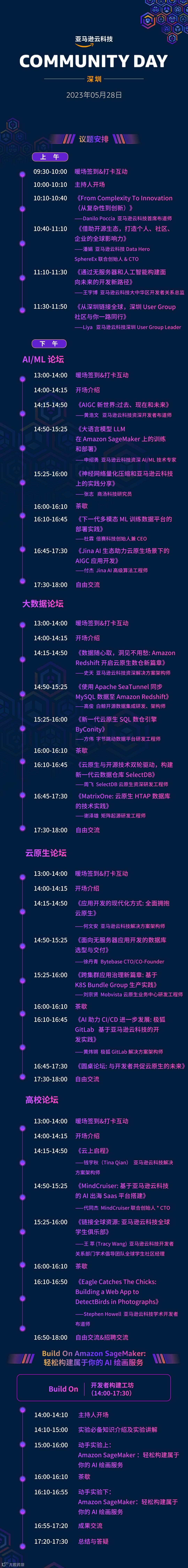 Community Day 是亚马逊云科技全球品牌和社区旗舰活动,由社区领导者发起,汇聚来自世界各地的亚马逊云科技专家、用户及行业领袖针对云计算相关技术进行讨论。旨在通过沉漫式学习体验为开发者提供一个以自己喜欢的方式获取知识、相互学习的场所。