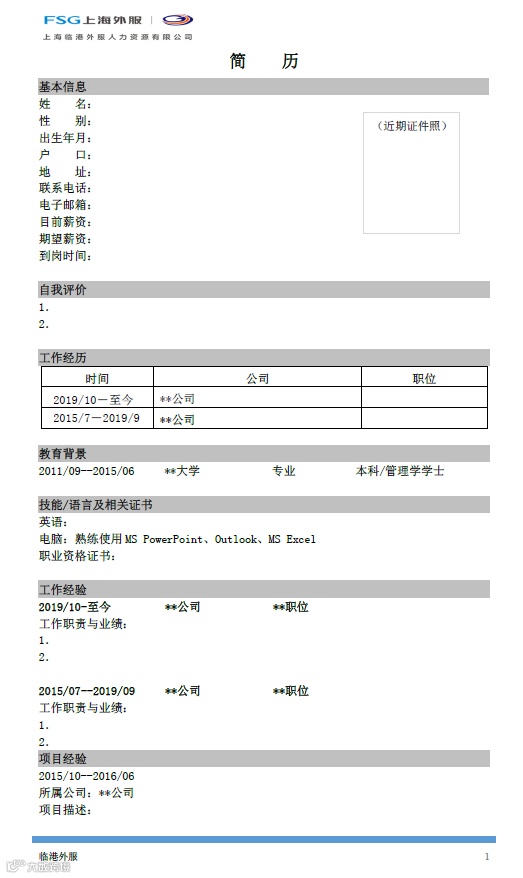 ①Word版本简历:简历中附上近期证件照,格式详见临港外服简历模板