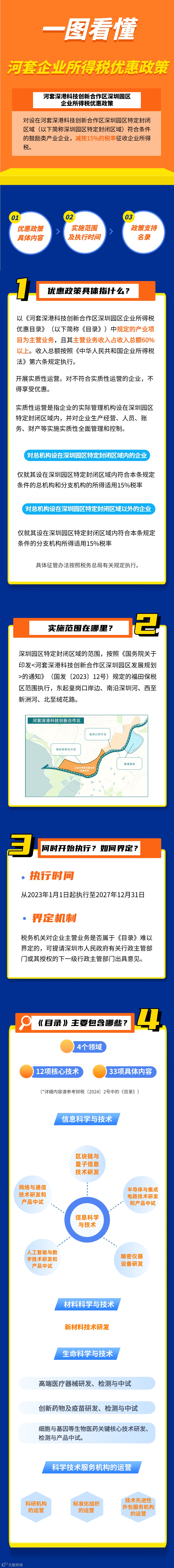 河套企业所得税优惠目录紧扣河套合作区深圳园区科技创新主题,聚焦科技创新关键环节和领域,瞄准关键核心技术,涵盖信息科学与技术、材料科学与技术、生命科学与技术、科学技术服务机构的运营等4大领域,12项核心技术,33项具体内容并对各项列明领域范围。