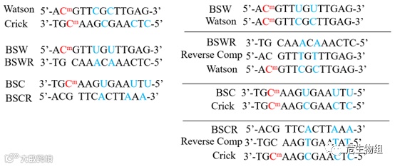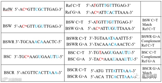为了便于表述,将U统一称为T,与NGS测序数据中的碱基一致。对于BSW链,未经Bisulfite处理时,原始链和基因组一致,经过处理未甲基化的C变为T,甲基化的C保留,所以此刻只需将甲基化的C转变为T即可与经过C>T转换的参考基因组(Watson链)一致。反之,当一条reads经过C>T转换时与经过C>T转换的参考基因组有最佳对齐结果则说明该reads为BSW。