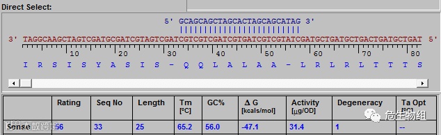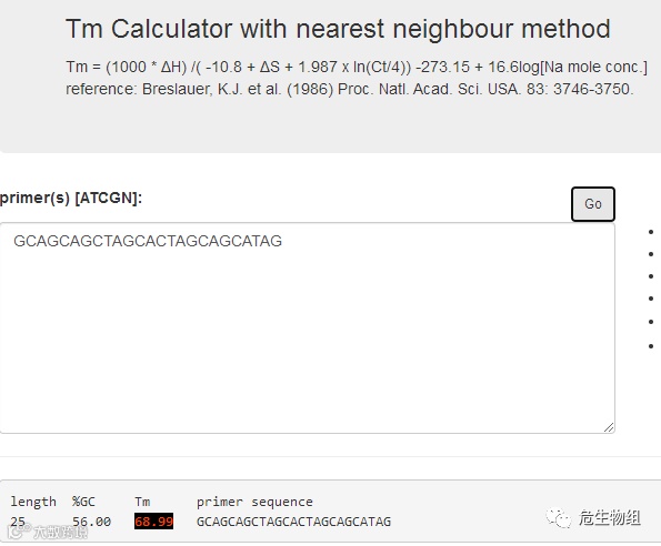 下面以一段引物5' GCAGCAGCTAGCACTAGCAGCATAG 3'为例子,比较不同计算方法对引物Tm估计的差异。首先利用primer5.0软件预测的Tm值为65.2摄氏度。而选择在线网页使用另外一种计算方式时,Tm值为68.99度。二者相差大约4摄氏度。可以看出,同一个引物在不同软件的预测中Tm值不同(备注:在两个软件的Tm值计算中,我已经将Na离子浓度等其他因素调整为一致的)。
