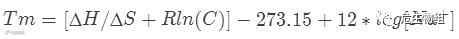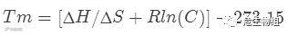 上面的方程只考虑了引物自身碱基组成对Tm值的影响。根据Tm值的定义,DNA在解链50%时对应的温度。而事实上,当DNA能够达到解链50%的程度时,环境状态如盐离子浓度,DNA自身结构是否对解链有影响呢?如果有影响,那么当DNA解链50%的实际对应温度和用上述方程式估算的温度就存在显著不同。因此,基于这些考虑。研究DNA热力学的科学家在早期就进行了大量理论及实验推导。因此,关于引物Tm值计算的邻近二态模型被提出,引出了第二个公式: