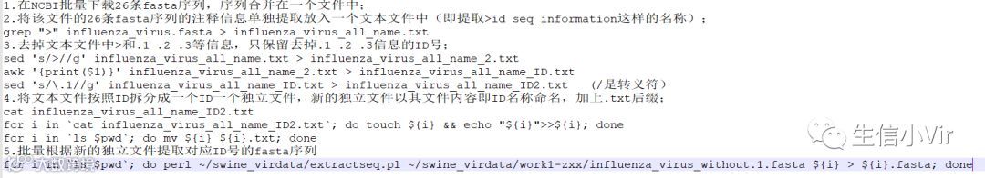 思路:1、grep提取fasta序列的信息;2、用sed把> 以及.1信息删除,在删除.1时,由于.在正则表达式中属于通配符,会把ID里所有的1同时匹配去除,因此使用sed删除.1时需要加上转义符\,将.的含义取消;3、只提取ID号,因为ID号和序列information之间有空格,因此可将其看作列表格式,用awk命令提取第一列即序列的ID号即可。4、把文本文件根据ID号进行拆分和命名,同时新的文本文件里的内容也是ID号。即用cat命令将influenza_virus_all_name_ID2.txt里的ID号输出到终端,用for循环批量创建文件(touch)并输入文件内容(echo);再把文件加上.txt后缀(mv)。5、最后用一个perl脚本提取对应ID号的fasta序列,注意需用引导符>指定输出文件。