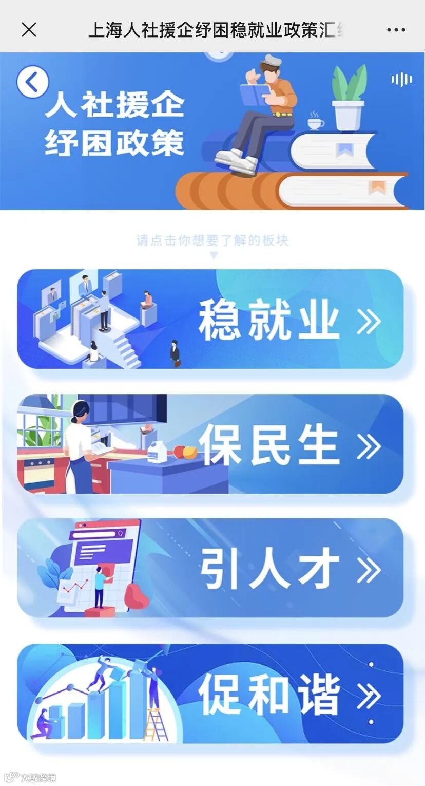 在首页选择“点击查看”后,即可选择上海人社涉及支持抗疫的四大板块政策,分别是“稳就业”“保民生”“引人才”“促和谐”。您可以根据您的需要点击相应的板块。