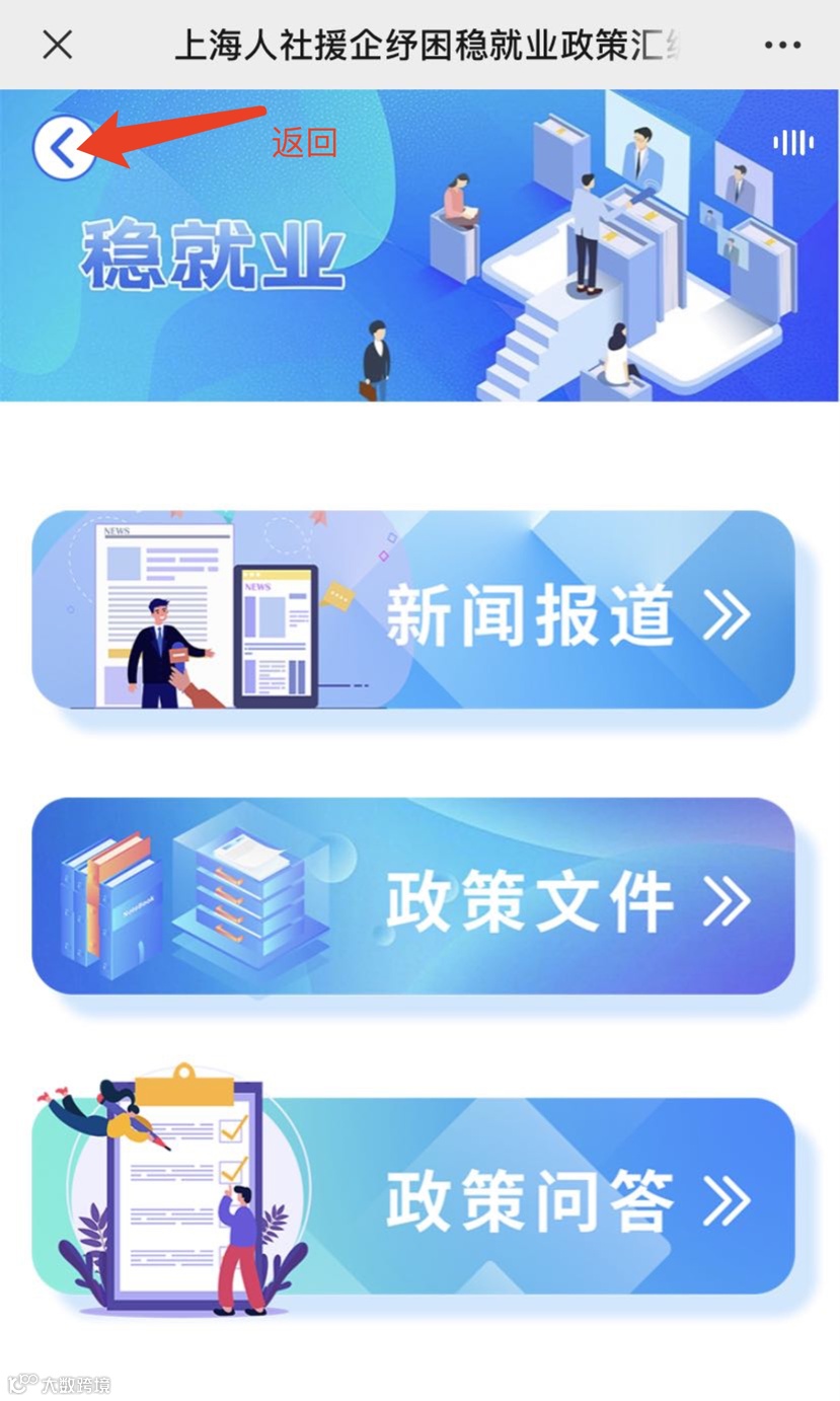 每个板块都配有新闻报道、政策文件和政策问答三个选项。您可以根据需要点击相应内容。建议使用页面左上角按钮进行返回上一页的操作。