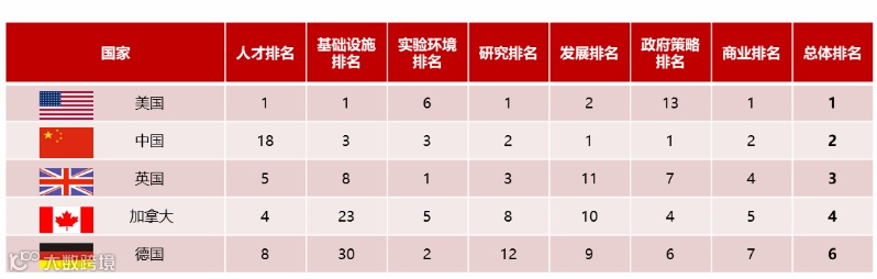 得益于长期的政策利好,我国的AI研究水平稳步上升。根据TortoiseIntelligence发布的AI指数,对世界各国人工智能进行排名,综合来看,我国仅次于美国排名第二,单项指标中,发展指标和政府策略指标更是位居首位。