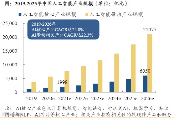 据艾瑞咨询预测,2021年我国人工智能核心产业规模预计达到1998亿元,2026年AI核心产业规模预计超过6000亿元,带动产业规模预计为21077亿元。