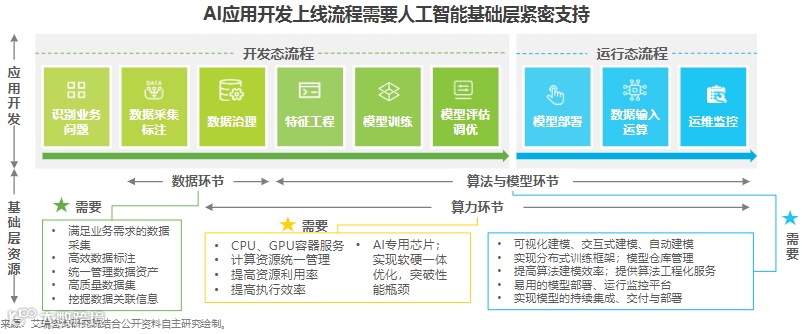 开发一项人工智能模型并上线应离不开数据、算法、算力三大基础层的支撑。未来人工智能的产业方向将不仅局限于上层的应用开发,而且会愈发重视基础层的地位与价值。
