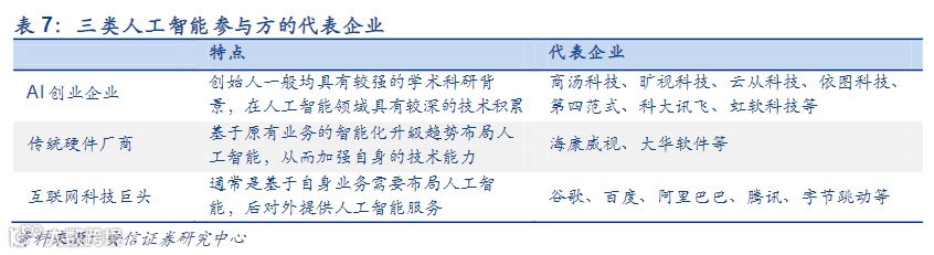 在人工智能发展的大浪潮中,入局者众多,目前行业内的参与方主要分为三类: