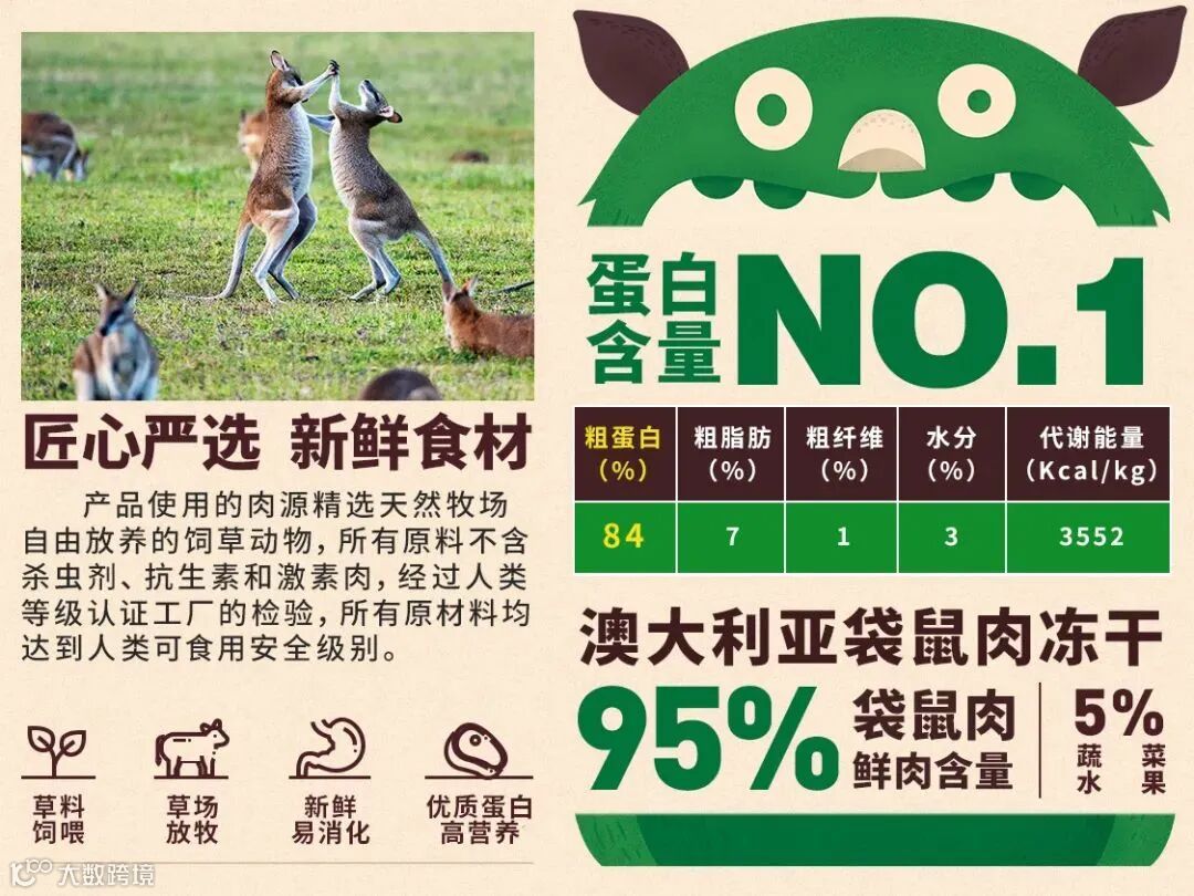 袋鼠肉是世界上最瘦的红肉蛋白之一,富含易消化蛋白质,低脂肪,是需要低脂饮食和超重宠物的首选美食!