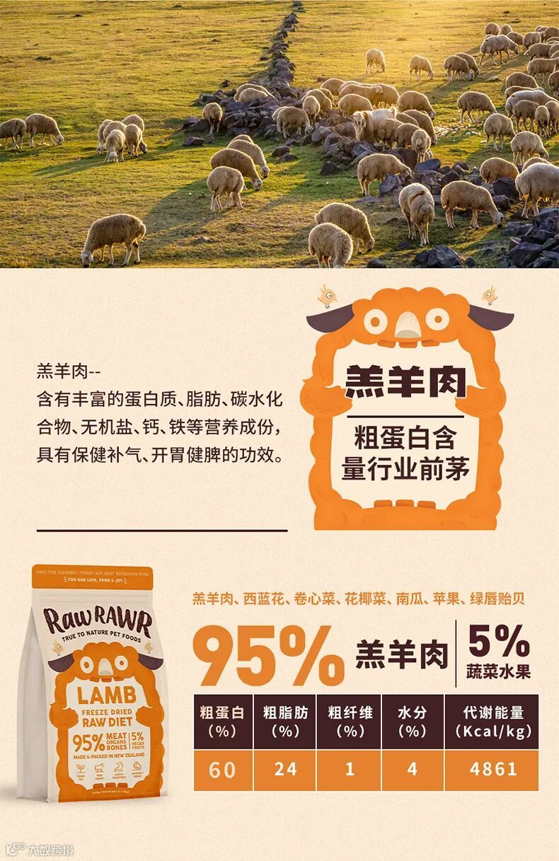 RAWRAWR冻干选用的新鲜肉源均来自可溯源的新西兰天然牧场和深海鱼类,纯净无污染,同时配方经过严格的标准制定,95%的生骨肉,添加5%的蔬菜水果,均衡营养配比,完全来自肉类的蛋白质,让主人喂得安心,宠物吃得开心!