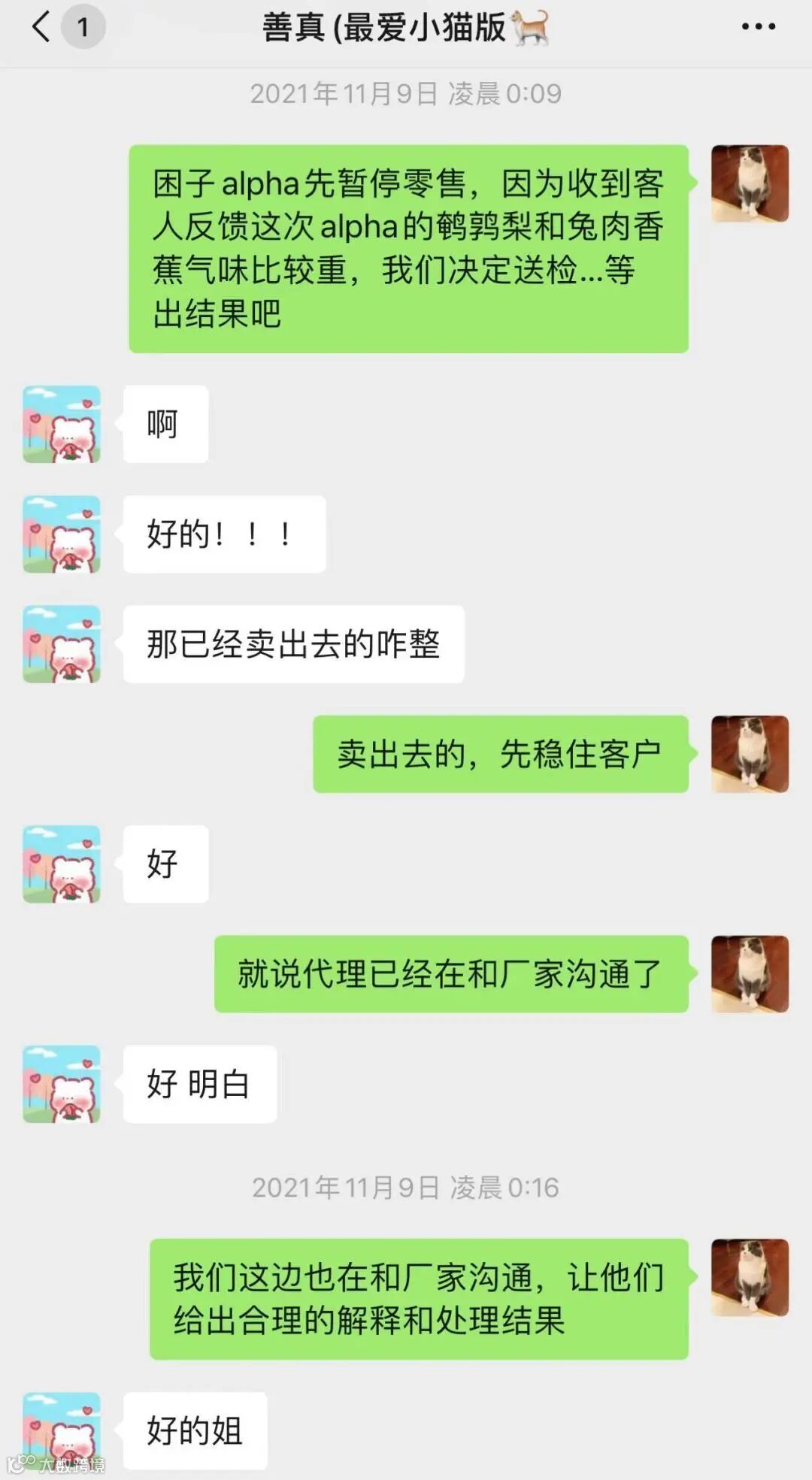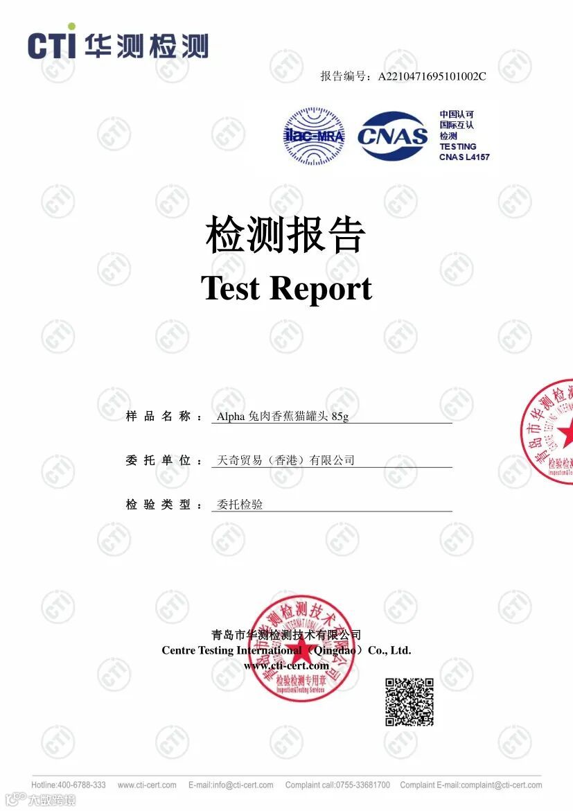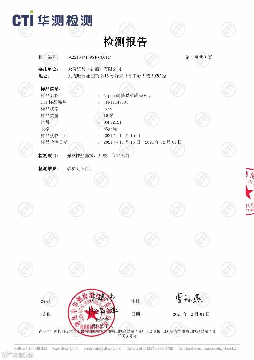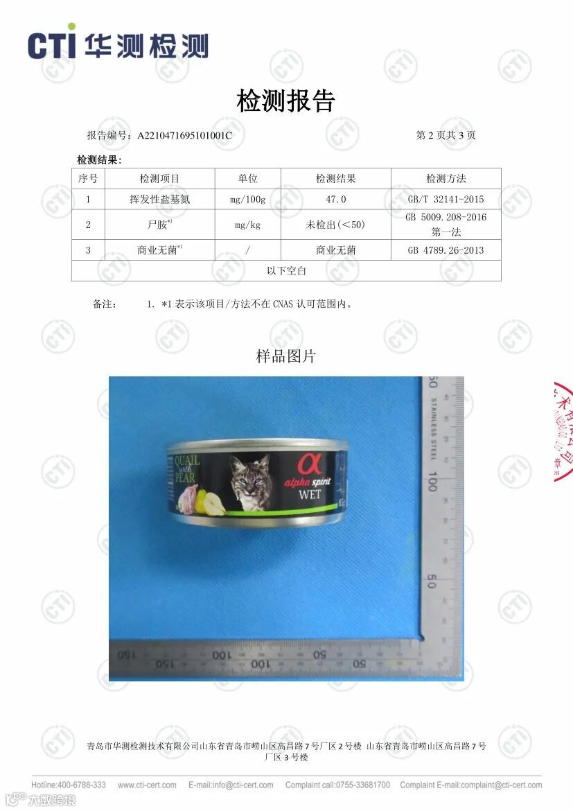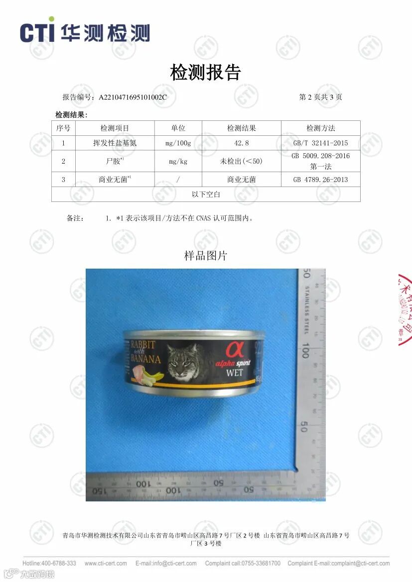 此外我们也第一时间与Alpha Spirit生产厂家沟通,要求厂家溯源此两批次产品的原材料以及跟进调查生产制造过程。厂家反馈调查结果为,该两批次罐头原材料理化指标符合标准,生产制造过程符合相关法律法规,出厂检验符合企业生产标准。与此同时该两批次罐头也比中国大陆早几个月在欧洲市场销售,均无顾客反映猫咪食用后出现不适的案例。