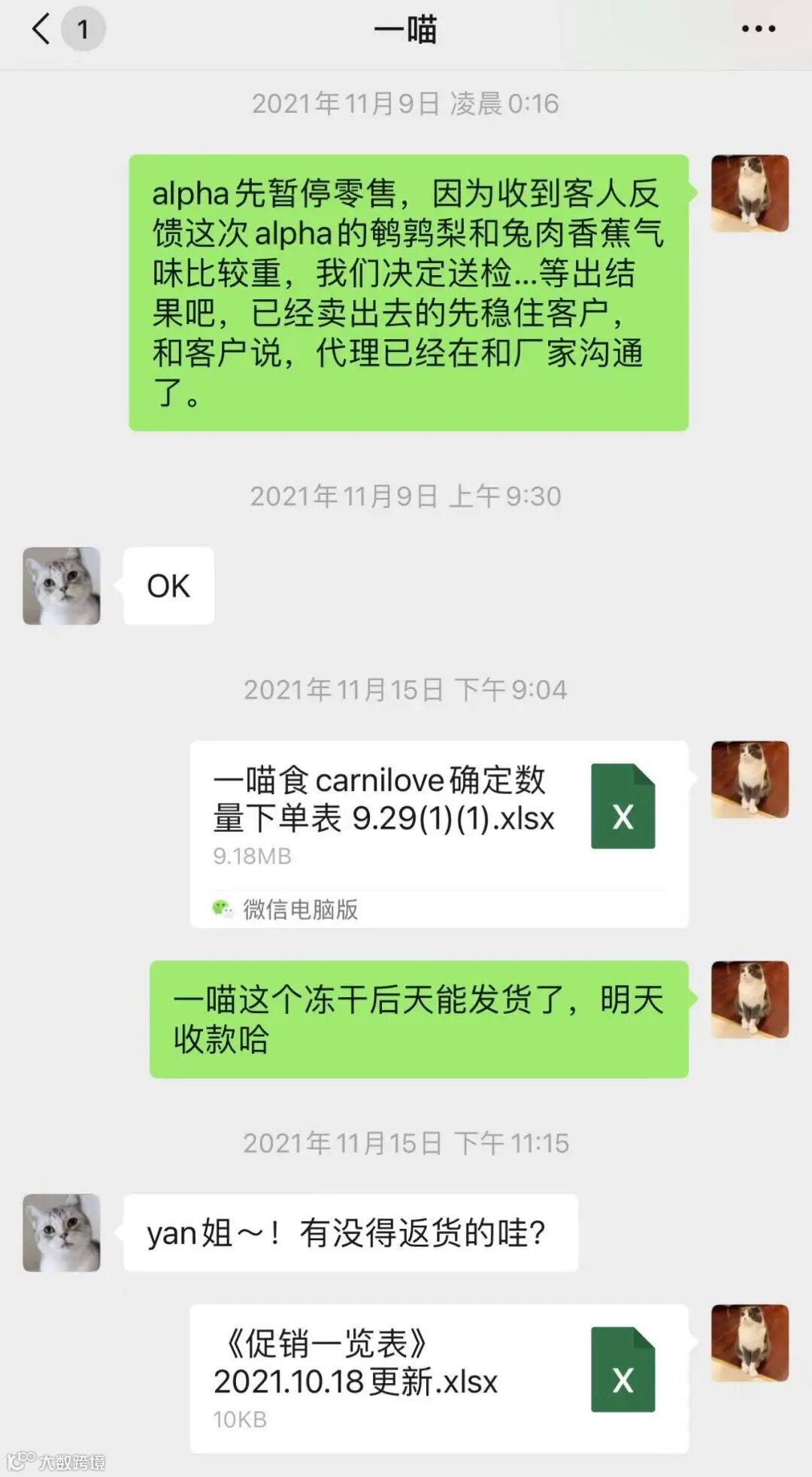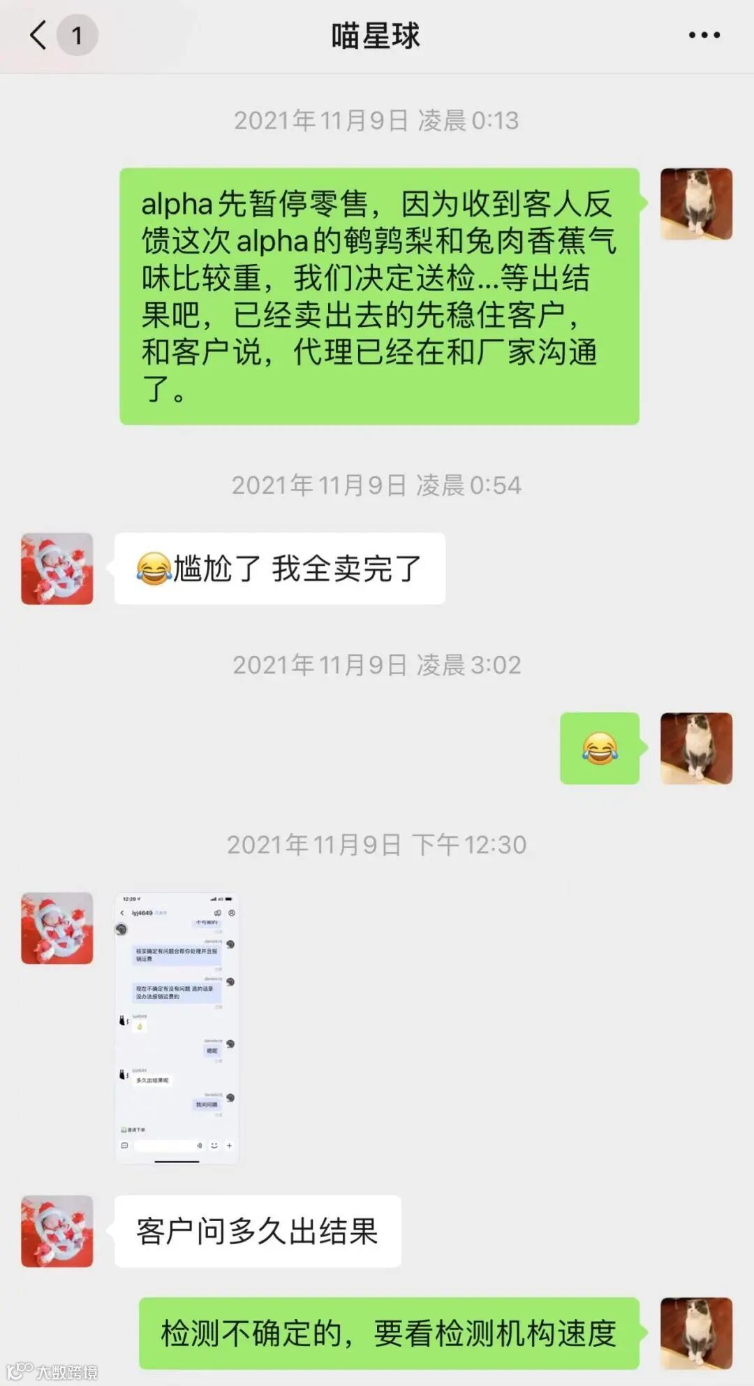 11月8号晚上天奇贸易接到客户反馈称,Alpha Spirit猫罐头QGP02121批次中的鹌鹑梨口味和CBA03521批次中的兔肉香蕉口味与以往批次的气味有些许差异。