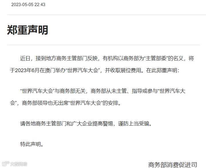 5月5日晚,商务部发布郑重声明,“世界汽车大会”与商务部无关,商务部从未主管、指导或参与“世界汽车大会”,商务部领导也无出席“世界汽车大会”的安排。原因是,商务部近日接到地方商务主管部门反映,有机构以商务部为“主管部委”的名义,将于2023年6月在澳门举办“世界汽车大会”,并收取展位费用。商务部表示,在此郑重声明:请各地商务主管部门和广大企业提高警惕,谨防上当受骗。