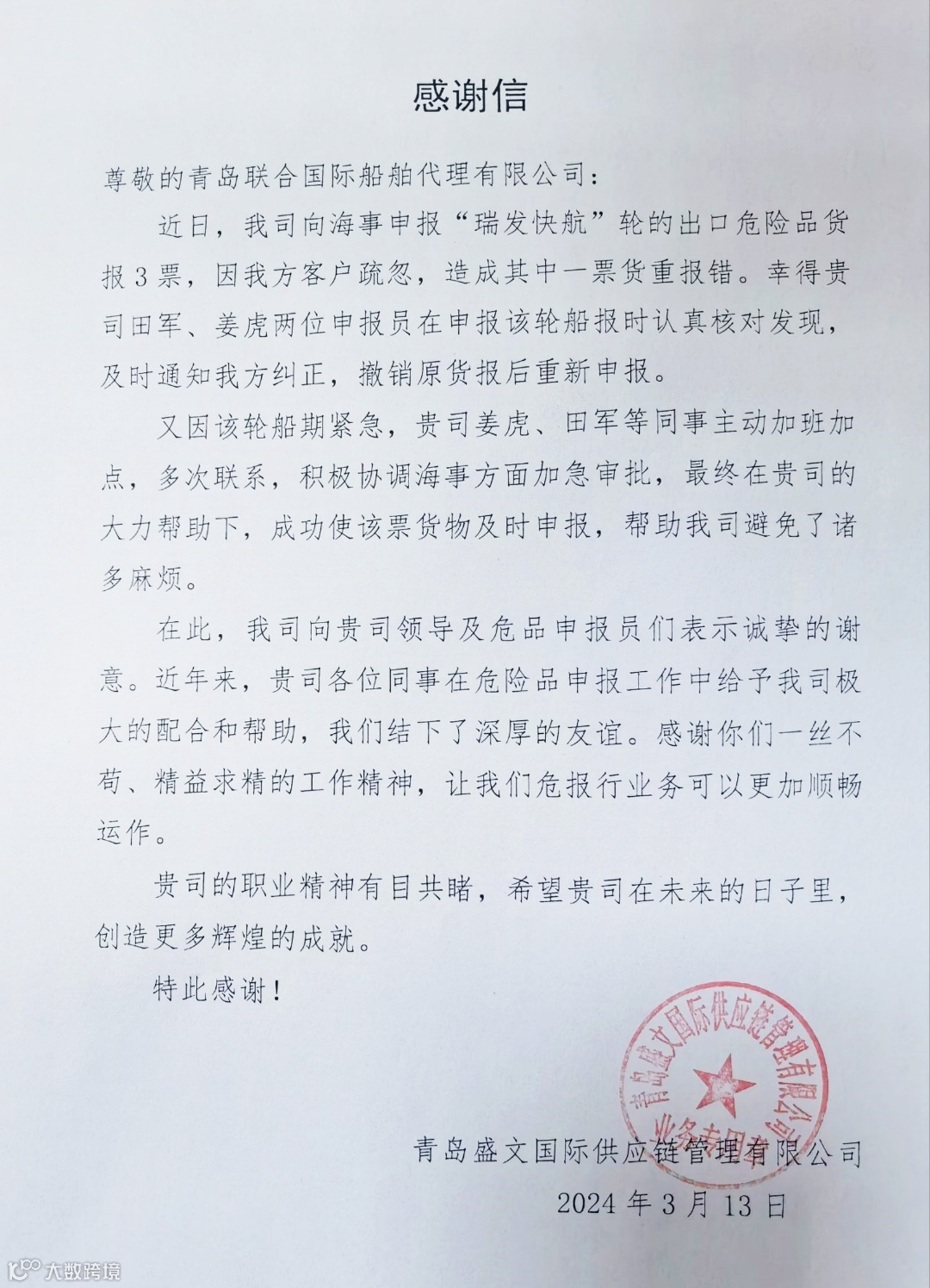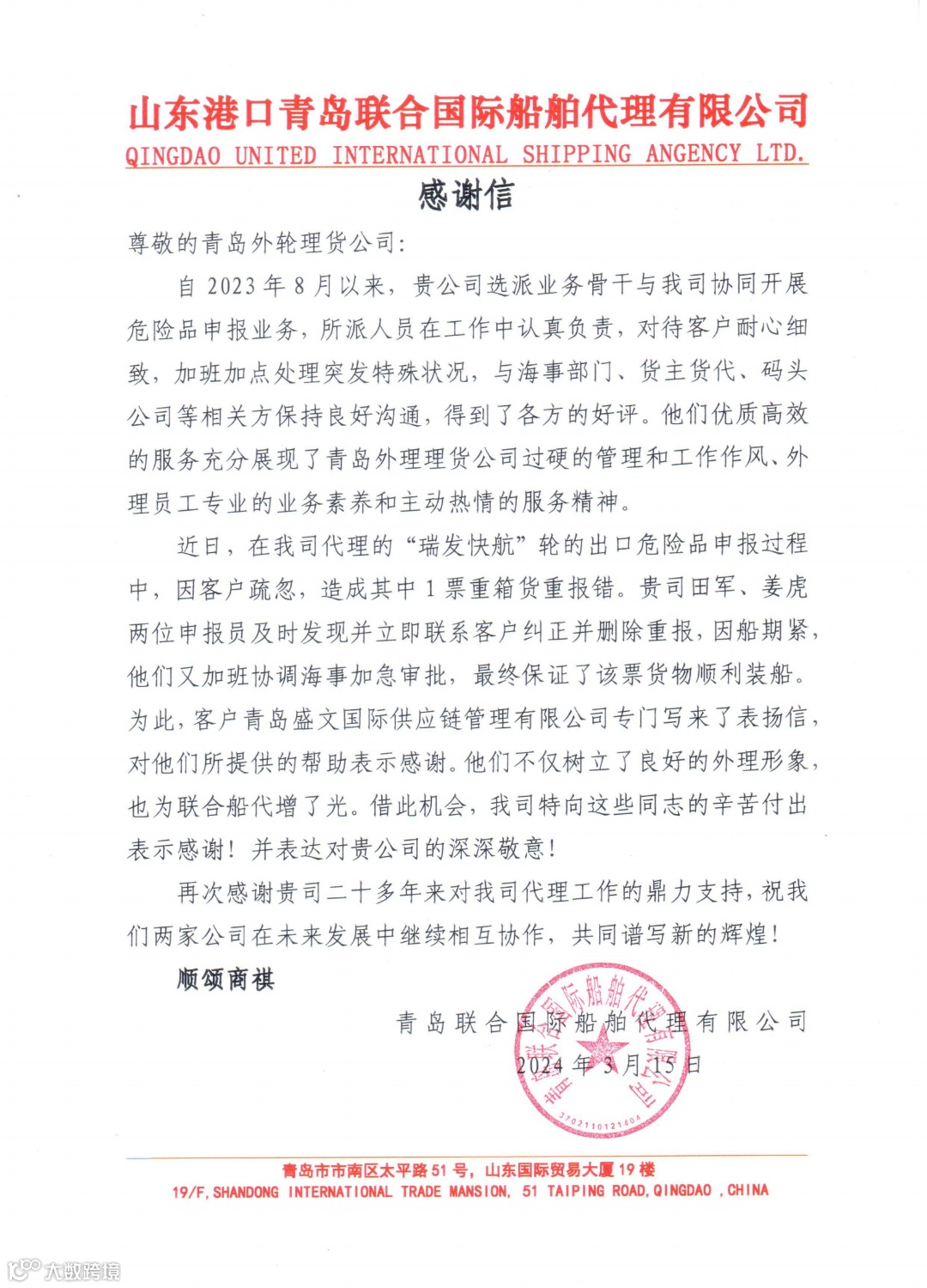 信中既肯定了业务合作丰硕成果