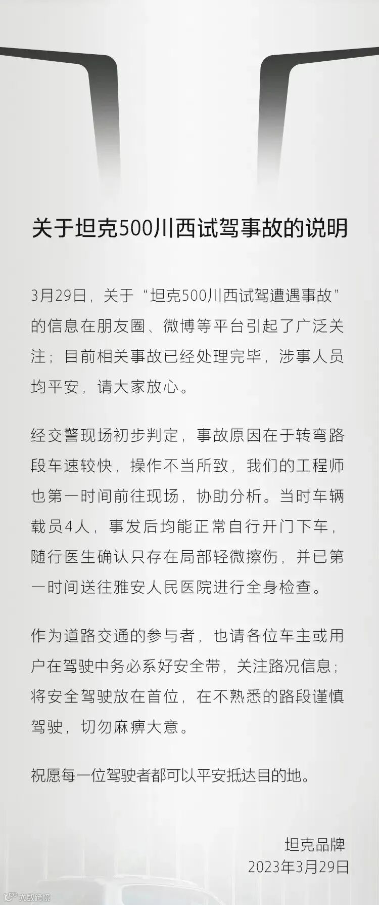 3月29日,关于“坦克500川西试驾遭遇事故”引发广泛关注,有自媒体在试驾坦克500的过程中发生意外,虽然车上的人员并未出现严重伤情,但大家认为这起事故正因为专业度不够所导致的,相关讨论的声音十分激烈。当天,坦克官方也发布相关说明:经交警现场初步判定,事故原因在于转弯路段车速较快,操作不当所致,坦克工程师也第一时间前往现场,协助分析。坦克官方表示,当时车辆载员4人,事发后均能正常自行开门下车,随行医生确认只存在局部轻微擦伤,并已第一时间送往雅安人民医院进行全身检查。与此同时,坦克官方也强调:作为道路交通的参与者,也请各位车主或用户在驾驶中务必系好安全带,关注路况信息;将安全驾驶放在首位,在不熟悉的路段谨慎驾驶,切勿麻痹大意。祝愿每一位驾驶者都可以平安抵达目的地。