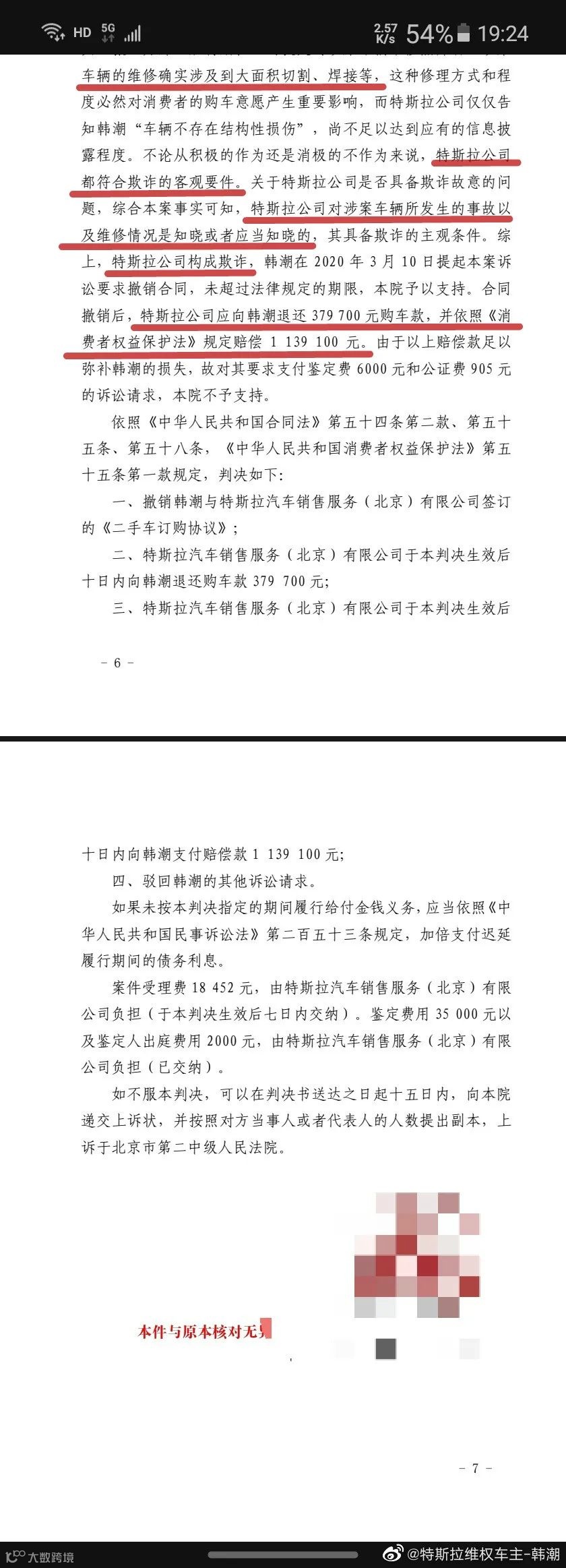 今日,特斯拉“退一赔三”案的当事人韩先生在其个人微博发文称:北京市高级人民法院依法裁定驳回特斯拉的再审申请,三年多的案子终于定论。相关事件回顾,2019年车主韩先生,花费了37.97万元在特斯拉官网上购买一辆特斯拉官方认证二手车Model S P85,后来在用车过程中总是发现一些小问题,车主通过第三方机构检测,发现车辆C柱及后翼子板有切割焊接,车主韩先生认为车辆此故障会直接威胁生命安全提出退换车辆请求,但遭到拒绝。随后,车主韩先生决定起诉特斯拉公司,通过法律途径解决此事。而对于韩先生反映的情况,特斯拉方面曾表示,在原车主使用车辆期间,车辆在2019年1月8日在行驶变道时发生极为轻微的碰撞剐蹭事故。根据现场照片、定损协议书、事故认定书以及维修单等证据,可以证明事故只伤及车身左后部叶子板及后保险杠边缘及轮毂表面,完全没有伤及车辆安全结构,不构成重大事故或者结构性损伤;特斯拉公司对该事故也不知情,不存在欺诈的故意。且涉案车辆不存在重大事故,也不存在因更换叶子板而产生结构性损伤,特斯拉公司在销售车辆时未实施任何欺诈行为,向韩先生交付的车辆完全符合“没有重大事故以及火烧泡水”的销售承诺,韩先生的诉讼请求没有事实和法律依据,应当全部予以驳回。2020年12月,该案件有一审判决结果。据车主发布的判决书显示,一审结果为特斯拉公司购成欺诈,判其退一赔三。即购车合同撤销,特斯拉退还37.97万元购车款,并赔偿113.91万元。