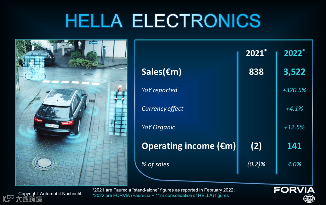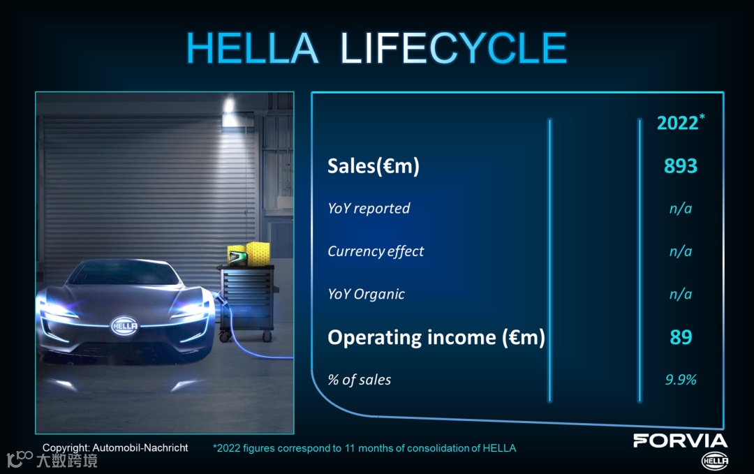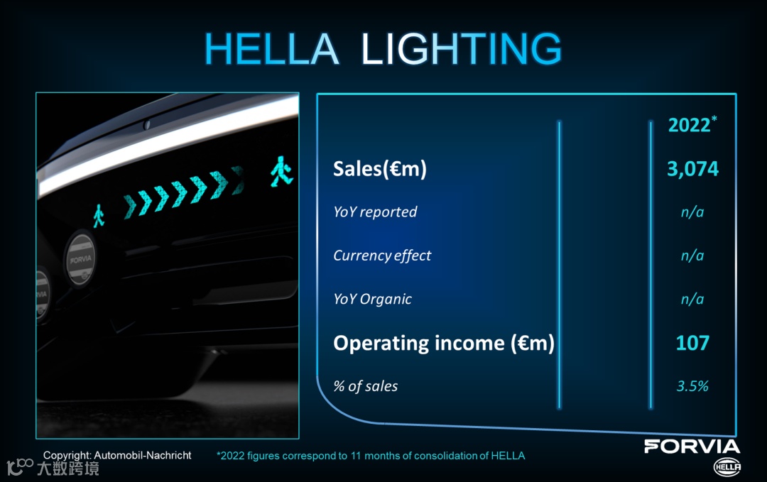 海拉的另一优质资产车灯业务的SSL | HD前照明大灯、Flatlight尾灯等技术闻名全球,因此,2022年的营收表现业务非常不错。从佛吉公布的数据来看:海拉2022/2~12月销售额为31亿欧。但从最近海拉公布的财报数据来看,2022/6/1~2022/12/31车灯业务销售额达21亿欧。海拉在2022自然年的实际销售额肯定远超31亿欧。