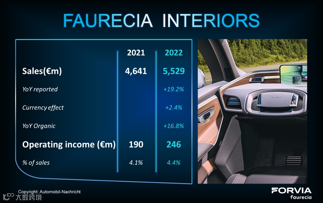佛吉亚另一核心业务——汽车内饰事业部2022年表现出色,销售额55亿欧,同比增长19.2%,其中汇率因素贡献了2.4%的增幅。得益于对通用、福特和宝马的营收的增长,佛吉亚内饰事业部销售成功实现两位数的增幅!