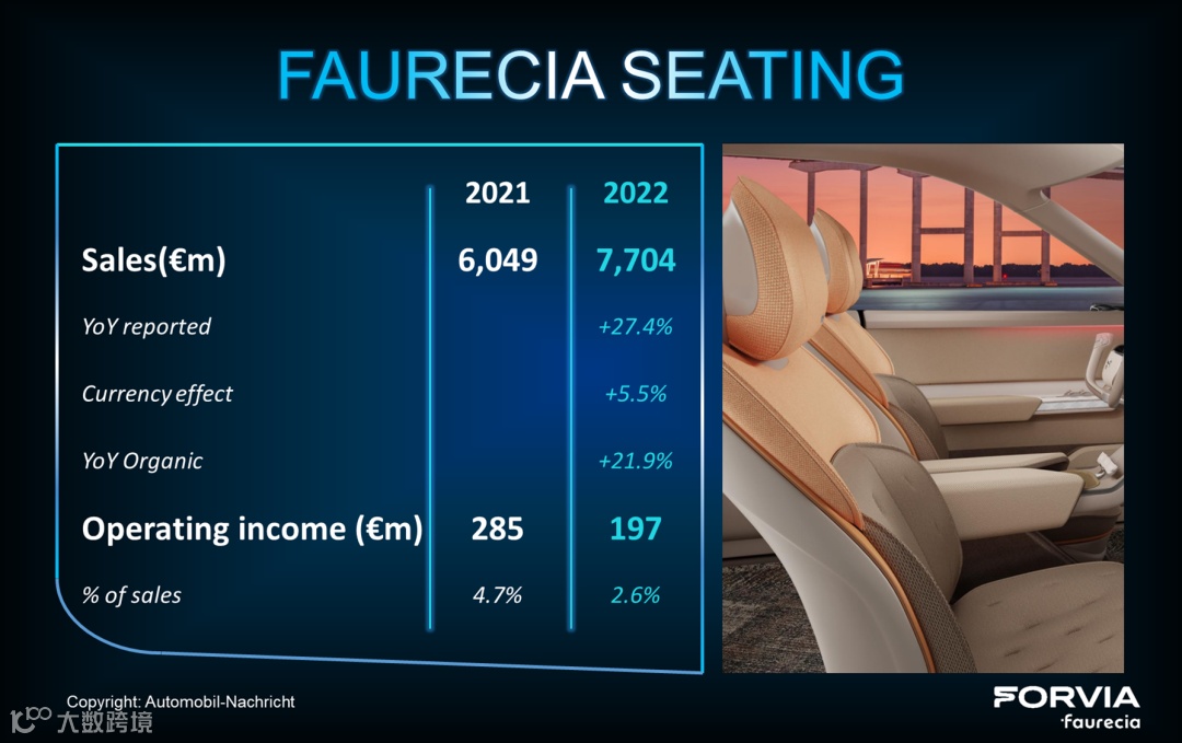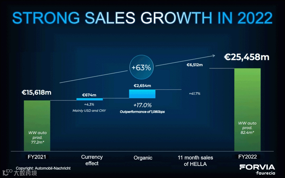 其中,佛吉亚自身业务2022全年销售额189.5亿欧,同比增长17%,远远跑赢全球汽车市场大盘(+6.7%)。由于受到美元对人民币和欧元走强的积极影响,佛吉亚去年销售额因此额外增长了4.3%。