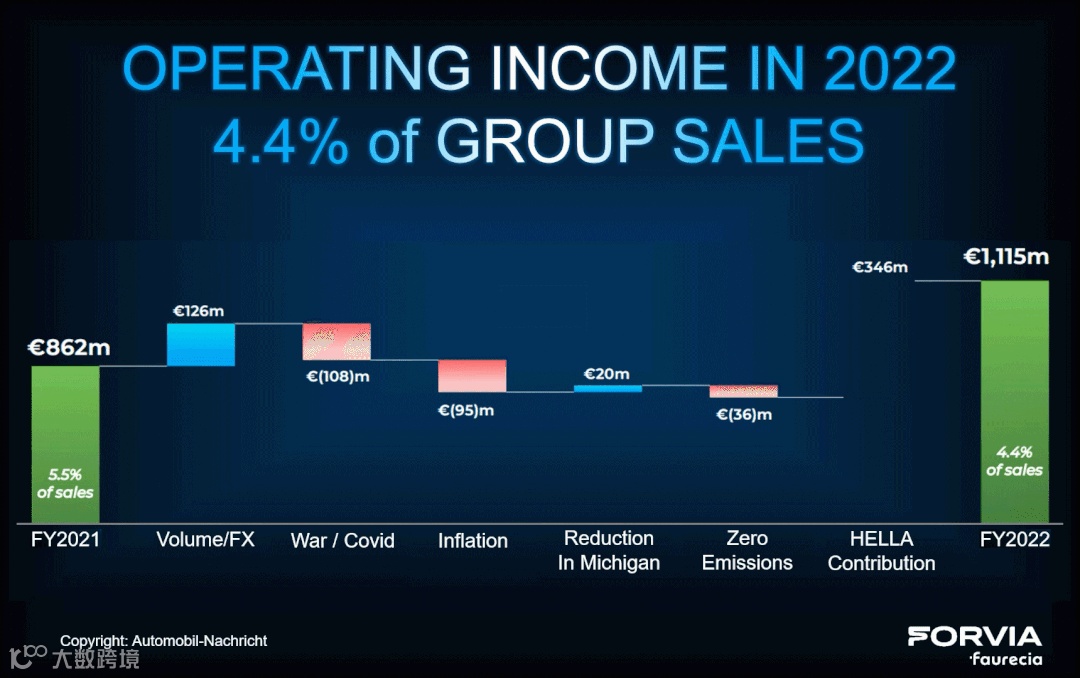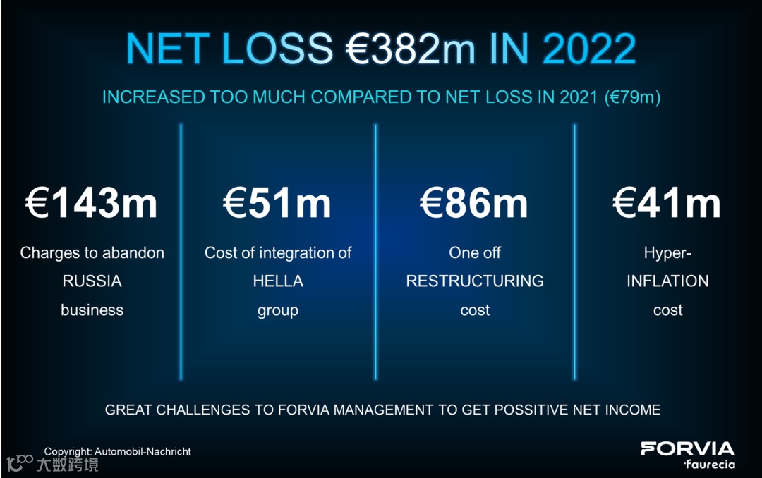 尽管海拉的到来,使得佛吉亚看到了未来转型的希望,但在热火朝天忙碌于整合业务的同时却不得不面对一个残酷的现实,就是2022年集团净亏损了4亿欧!其中: