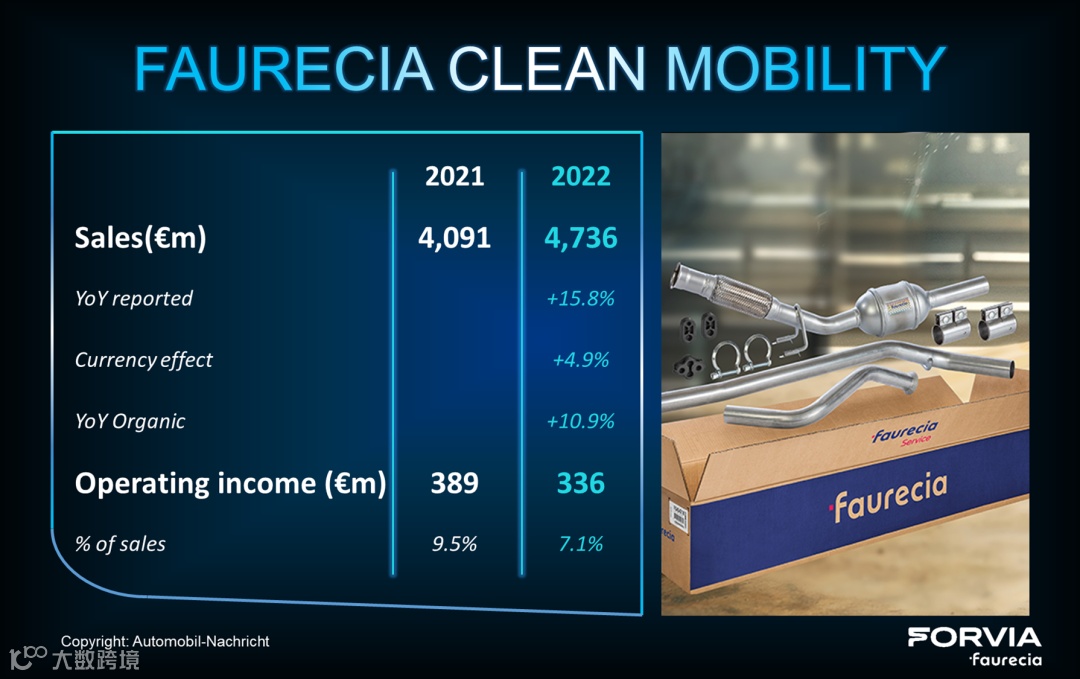 2022年,排气事业部依然贡献了3.36亿欧的营业利润,同比减少5300万欧。主要原因是高通胀影响吃掉了1个点利润,零排放前期研发吃掉的0.6%个点利润(2800万欧),以及额外费用支出了0.4个点。刨除这些不利因素,排气事业部主体营业利润理应达4.3亿欧,相当于座椅和内饰利润之和(4.4亿欧)。