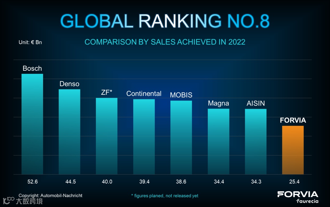 在海拉电子和车灯及售后业务的加持下,佛吉亚的全球排名从第10位上升至第8位,但与第7位的日本爱信精机和第6位的加拿大麦格纳之间尚有近百亿欧的差距。
