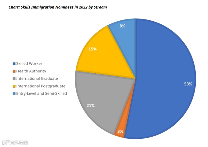 2022年度,53%的技术移民来自技术工人,37%来自国际留学生和硕博留学生。