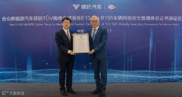 哪吒汽车获颁TÜV南德全球首张E13 UN R155 CSMS证书