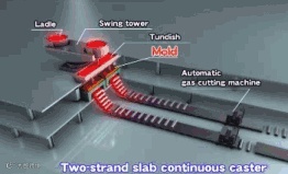 连续铸造 是利用贯通的结晶器在一端连续地浇入液态金属,从另一端连续地拔出成型材料的铸造方法。