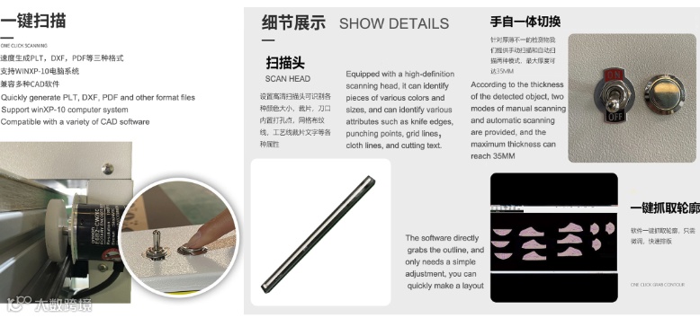 INVH template scanner, one click automatic scanning of templates, intelligent recognition of contour lines and cutting edges, easy digitization of bitmaps, can output DXF/PLT to various CAD software for editing and processing, and can also directly output to cutting machines, laser cutting machines and other devices.