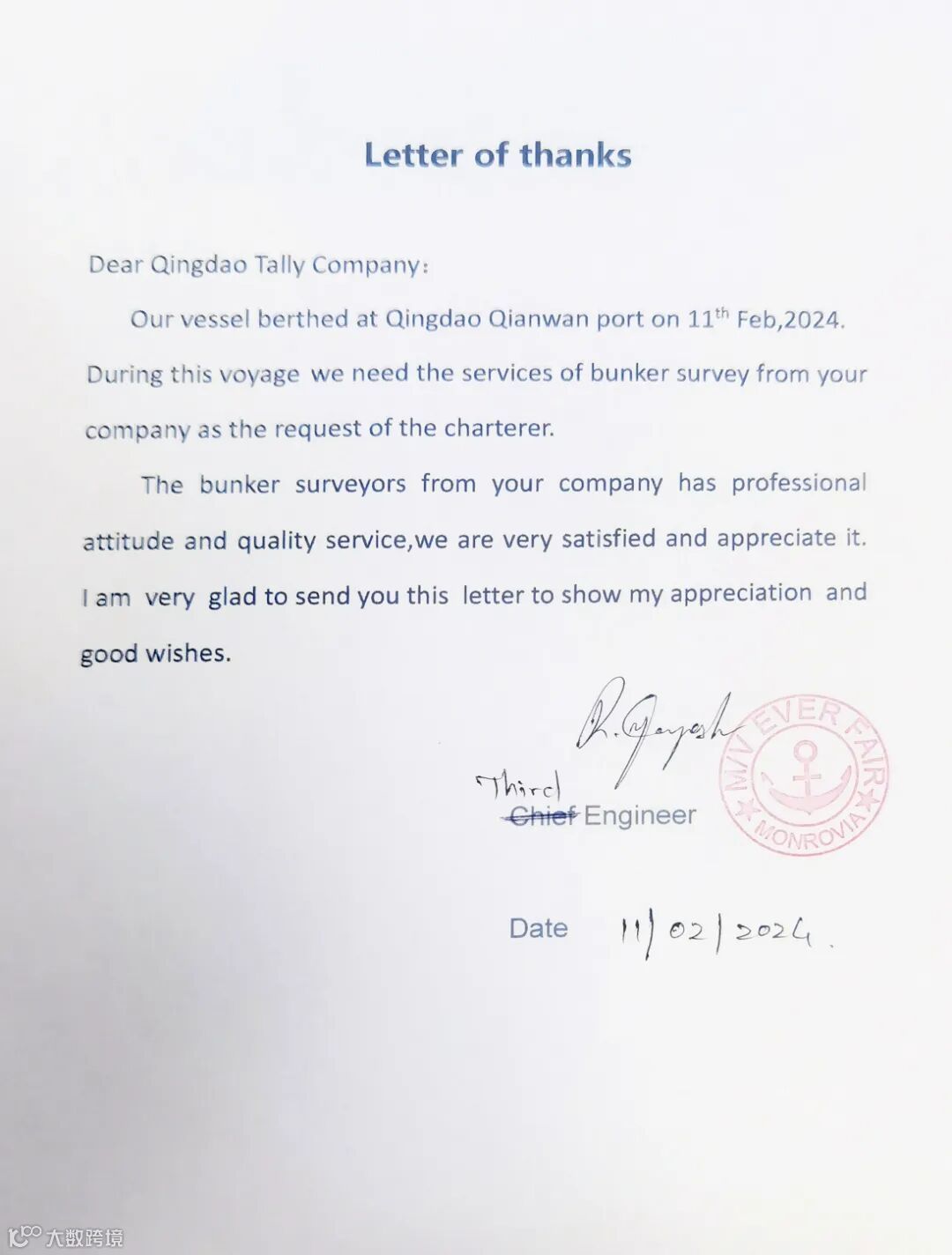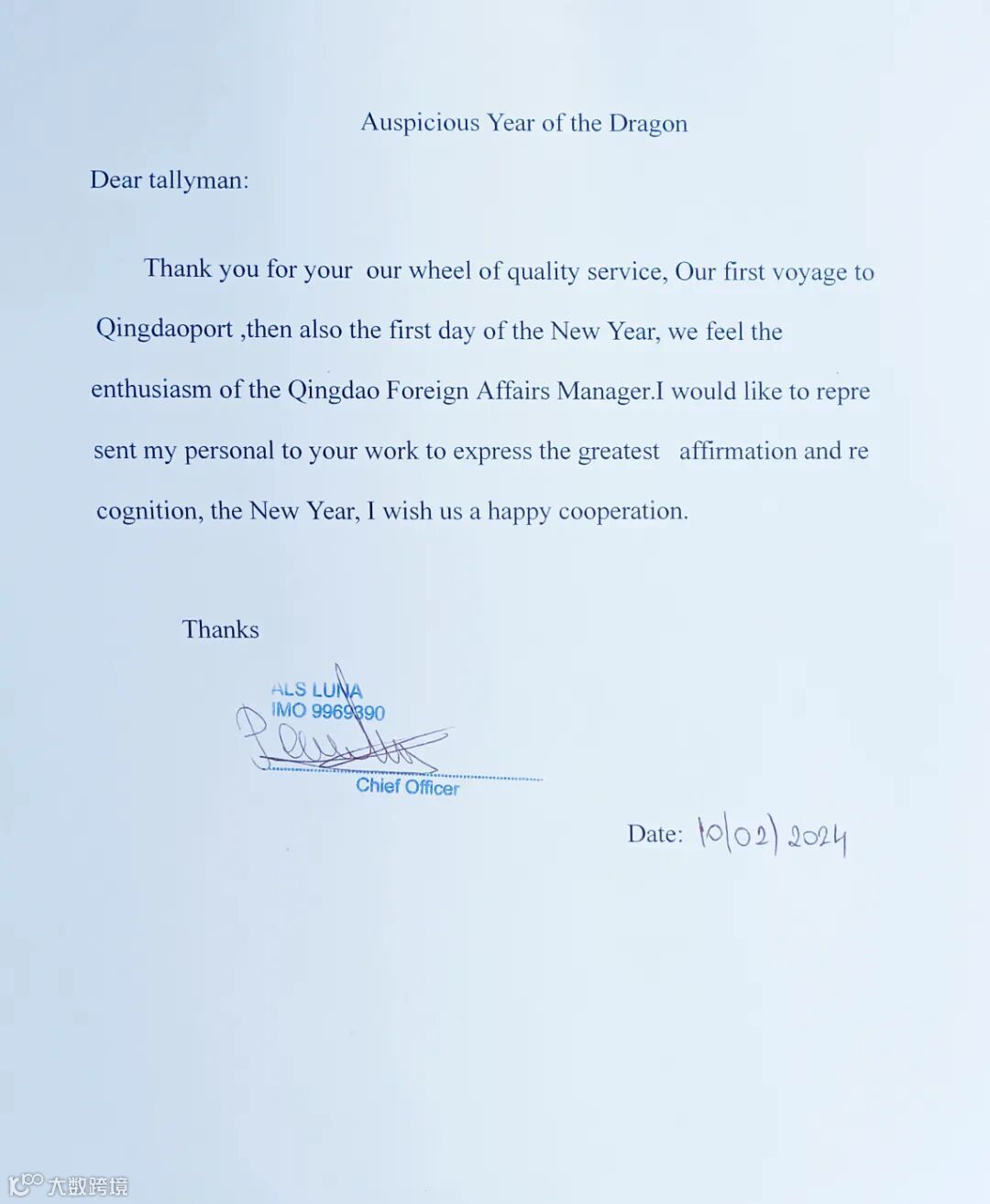 签证时,理货人员还向船方送上了中国春节的温馨祝福,大副发来感谢信,肯定理货人员的工作态度,点赞首次靠泊的暖心港口服务。