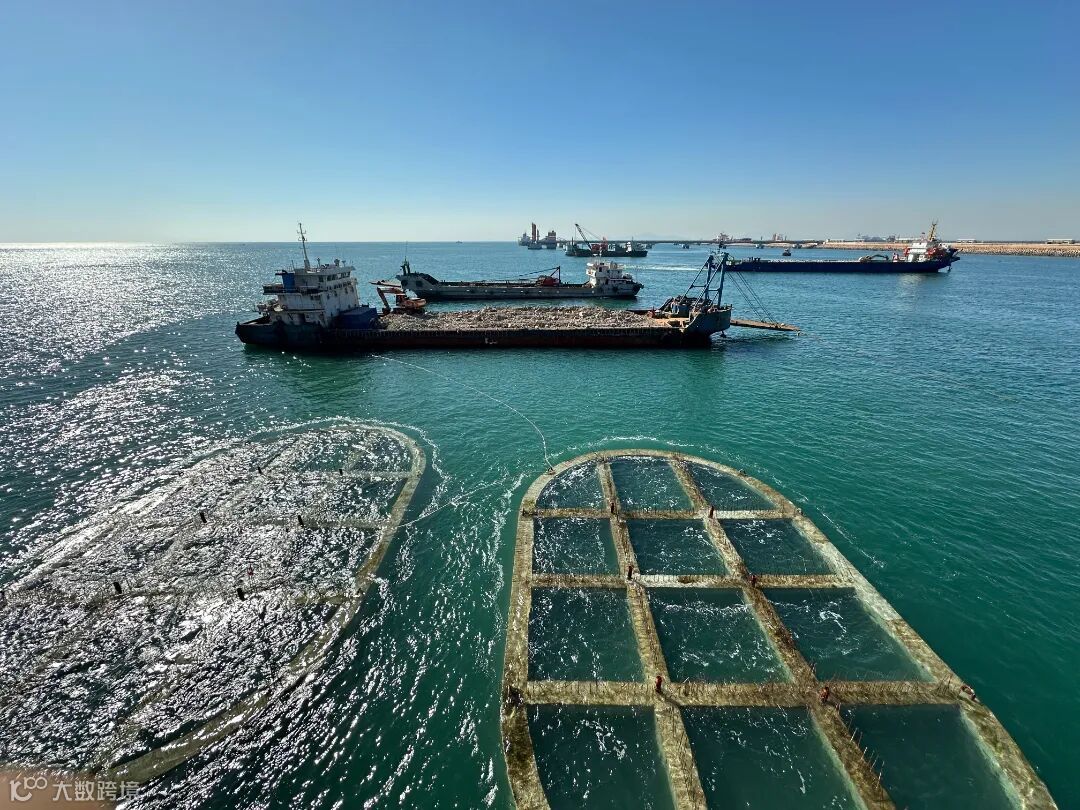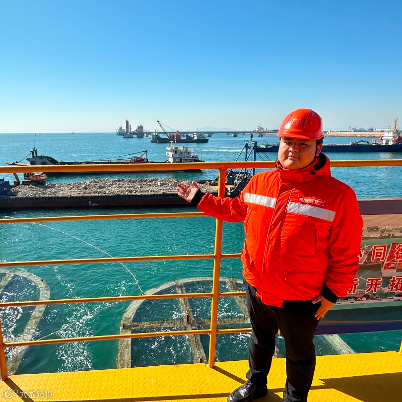 建设现场,工程船正在进行疏浚挖泥和基床抛石作业。该工程项目从2022年12月20日开始建设,预计将在董家口港区“战功赫赫”的40万码头旁边,再“镜像”出一个40万码头,项目创新采用了临时引桥、“点名出厂”的沉箱预制厂等技术,大大提高了工程建设效率。