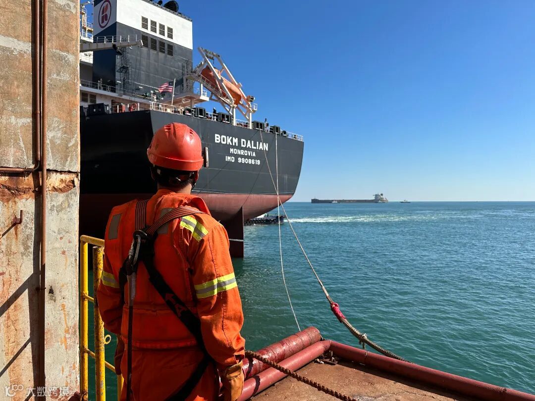 40万码头是董矿公司的主力码头,能靠泊世界最大的40万吨级矿石船舶。眼前“博克大连”轮正在靠泊,系缆工人在岸边系缆。今年7月2日“远谊海”轮作业中,董矿公司以单机效率3057吨/小时的作业效率,第26次打破世界纪录。今年以来,董矿公司共靠泊40万吨级以上船舶53艘,比去年同期同比增长17.8%。