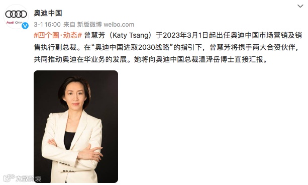 3月3日,奥迪中国通过官微发布《面向未来生产计划》。奥迪中国表示,从2026年开始,奥迪面向全球市场推出的新车型将全面切换为纯电动车,至2033年逐步停止内燃机车型的生产。在全球战略指引下,奥迪正在其自有生产基地,稳步推进纯电动汽车生产的准备工作。需要注意的是,几日前,奥迪中国发生一项重大高层人事变更。奥迪中国宣布,曾慧芳(Katy Tsang)于2023年3月1日起出任奥迪中国市场营销及销售执行副总裁,并直接向奥迪中国总裁温泽岳博士直接汇报。接棒该职位外,在“奥迪中国进取2030战略”指引下,曾慧芳将携手两大合资伙伴,共同推动奥迪在华业务的发展。对于曾慧芳的上任,奥迪中国总裁温泽岳表示:“曾慧芳女士在中国及全球市场拥有丰富的销售和市场营销经验,这对公司加速电动化转型发挥至关重要的作用”。