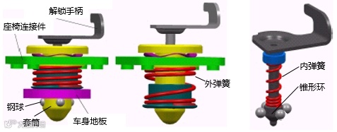 对于可以折叠两次同时还不能拆卸的座椅,我们发明了前面用螺钉,后面用球形卡簧的组合方案。业内称为Ballfix,该球形卡簧的工作原理如下:在图示的黄色圆柱套筒上,均布着四个圆形开口,其内部的四个金属球被允许以规定的尺寸从开口中伸出,但不会脱落(球的直径大于开口的直径)。套筒内部是一个弹簧加载的锥形环,工作状态它会一直将球推开保持在套筒开口位置,工作状态球头会卡在车身地板开口的后面,从而锁定座椅连接。解锁时,锥形环克服弹簧力被向上拉动,以便金属球可以向内移动进入套筒内部,此时座椅已经与车辆地板解锁,如果拉动座椅,整个锁定装置会从地板开口中移出。设计时需要加以注意的是,这个系统对尺寸公差非常敏感。此方案可以于奥迪A2和福特福克斯C-MAX。