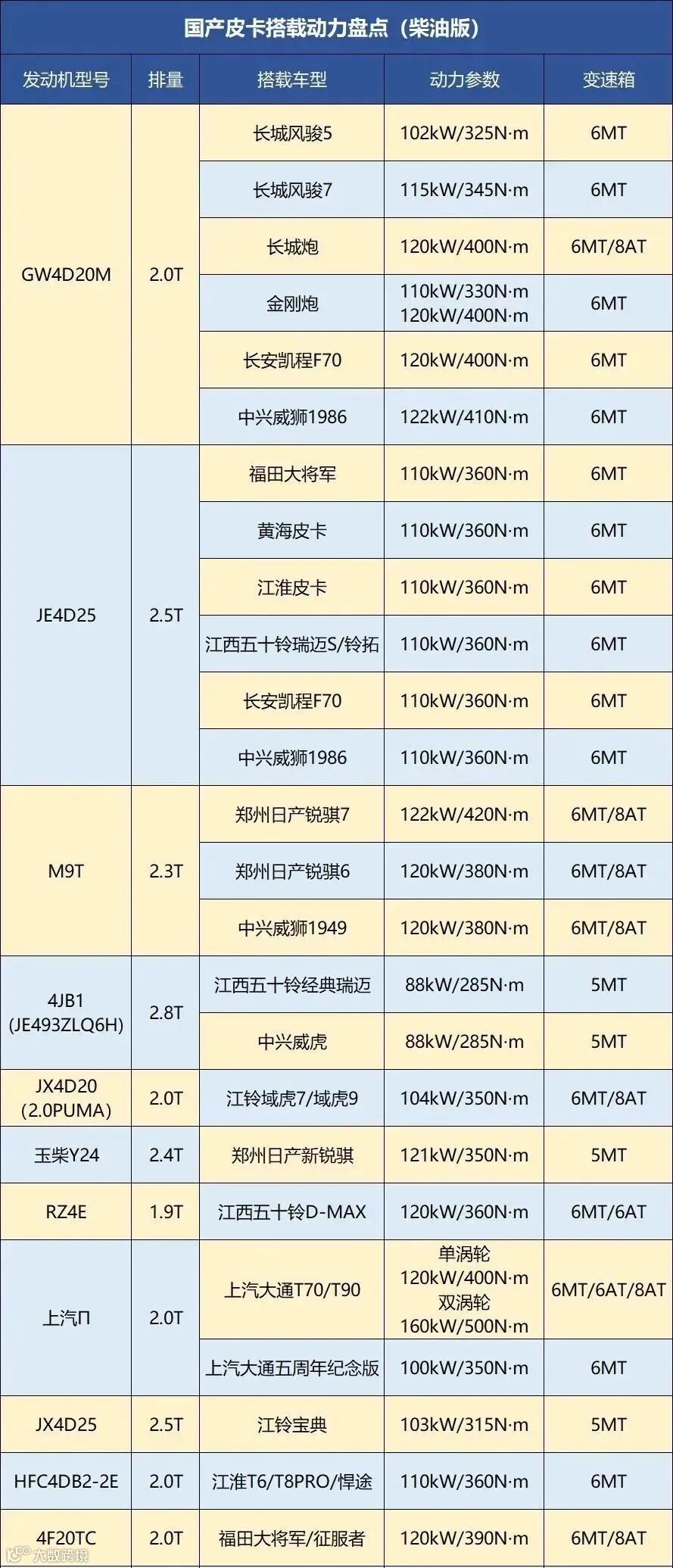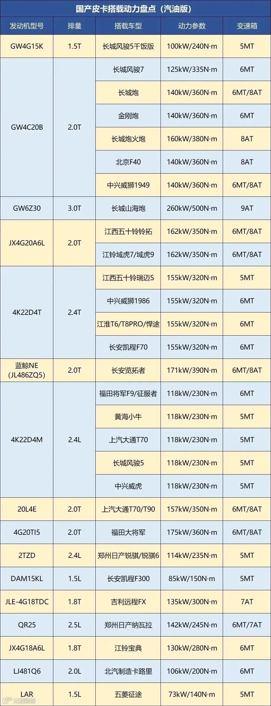 日前,皮卡车市总结了目前国内主流皮卡车型搭载的动力系统,包含其动力参数、搭载车型以及匹配的变速箱。