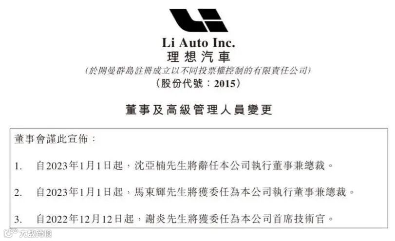 12月9日,理想汽车发布人事任命:总工程师马东辉将接替沈亚楠担任理想汽车总裁并进入董事会,整体负责研发与供应群组。高级副总裁谢炎将出任理想汽车CTO,全权负责系统与计算群组。执行董事兼总裁沈亚楠则退出董事会,加入理想汽车流程变革委员会。沈亚楠所管理的供应团队(包含供应链、制造、质量)将交由总裁马东辉管理,商业团队(包含销售、服务、充电网络)将交给CEO李想直接管理。以上任命,自2023年1月1日起生效。