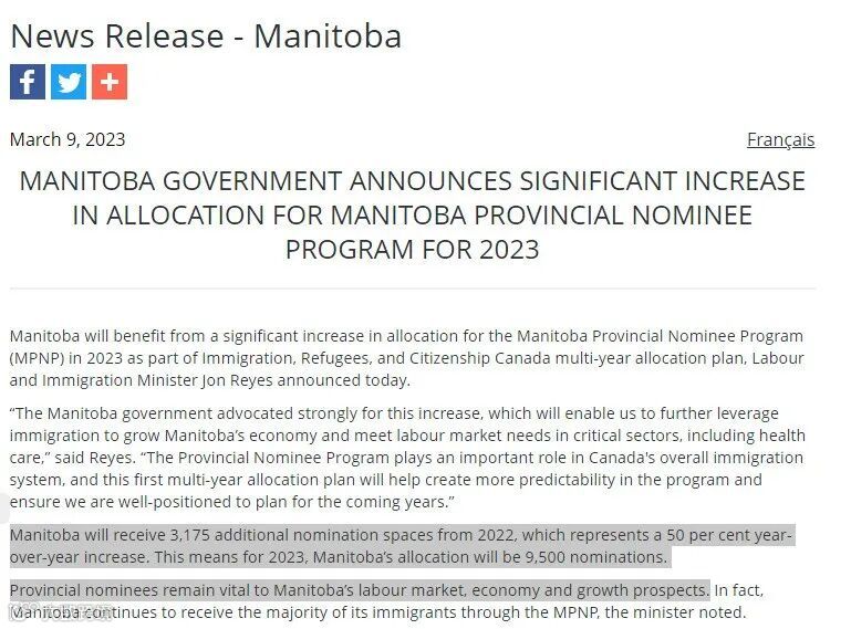 曼省移民部长表示:“省提名计划在加拿大的整个移民系统中发挥着重要作用,曼省强烈支持配额增加,这将使曼省能够进一步吸引移民来发展省内的经济。”