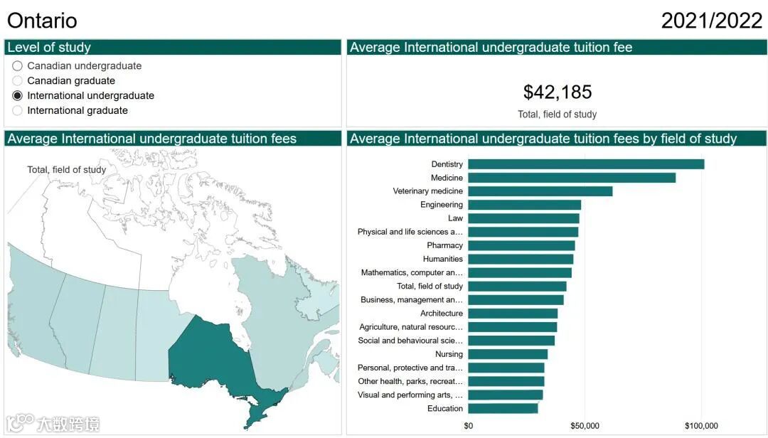 由于安省的学费高于全国平均水平,所以在安省学习各个专业的支出也较高,比如最贵的专业为牙医,平均学费超出$6万加元。
