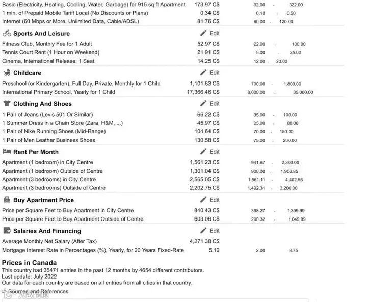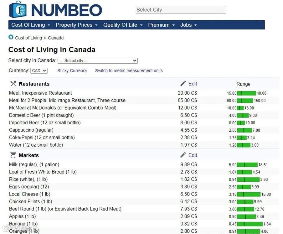 以下是加拿大平均生活成本的一些示例,取自 2022 年 8 月的 Numbeo: