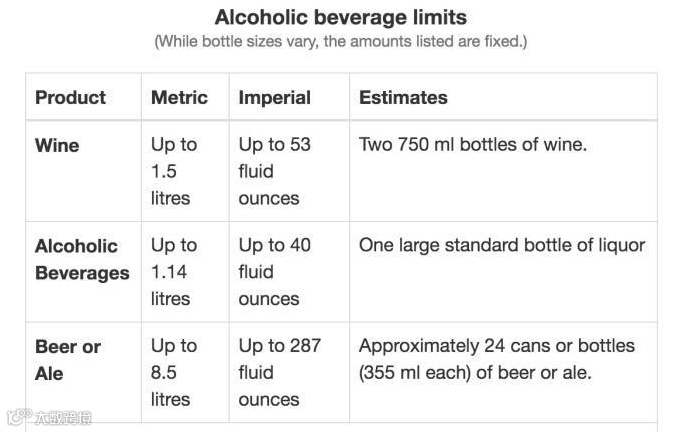 个人可免税携带:1.5升葡萄酒,1.14升酒精或24听355毫升或8.5升的啤酒入境加拿大。