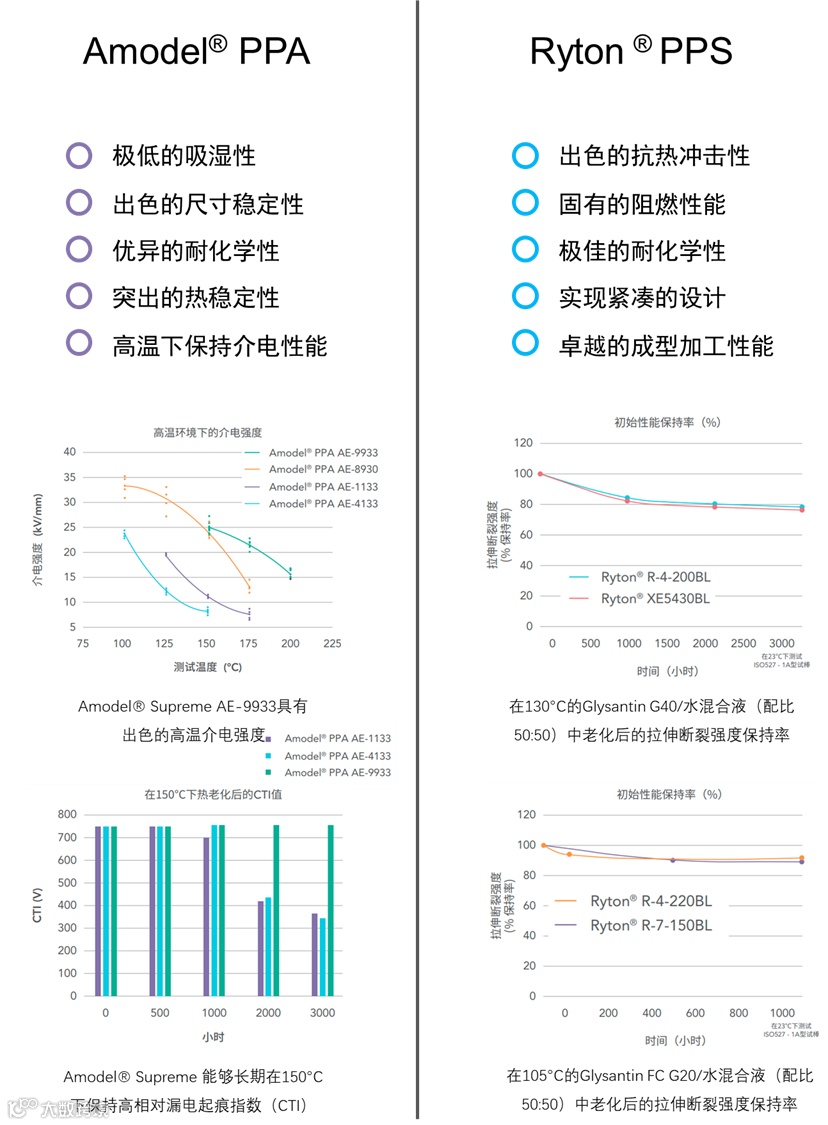 上图左侧列出了Amodel® PPA材料的优异性能,该材料在高温高湿的化学腐蚀性环境下工作数千小时后仍能保持机械完整性。因此,Amodel®PPA广泛用于轻量化解决方案,助力汽车OEM厂商打造更加安全和高效的混动及纯电动汽车。