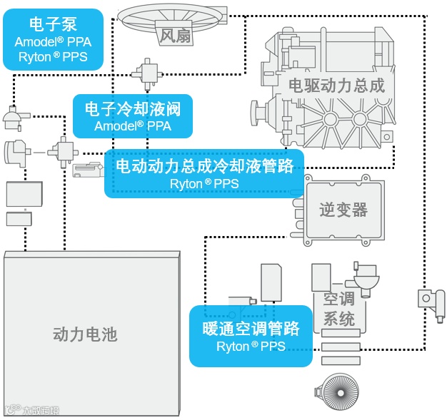 来自欧洲的著名化工材料巨头——索尔维(Solvay)长期耕耘汽车电气化领域,为市场和客户成功研发出了多款性能卓越的基础材料,如Amodel® PPA和Ryton® PPS等等。下面以电动汽车热管理系统为例,简要说明热管理核心零部件及其性能的优化方案。
