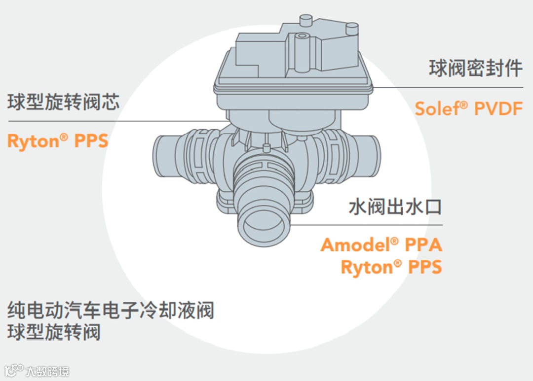上图以纯电动汽车最常用的电子冷却液球型旋转阀为例,展示了索尔维材料的具体应用方案:球型旋转阀芯可以用耐磨,耐高温,耐腐蚀的Ryton® PPS材料材料。而水阀出口则可选Amodel® PPA或Ryton® PPS材料。球型阀的密封件则可应用Solvef® PVDF材料。