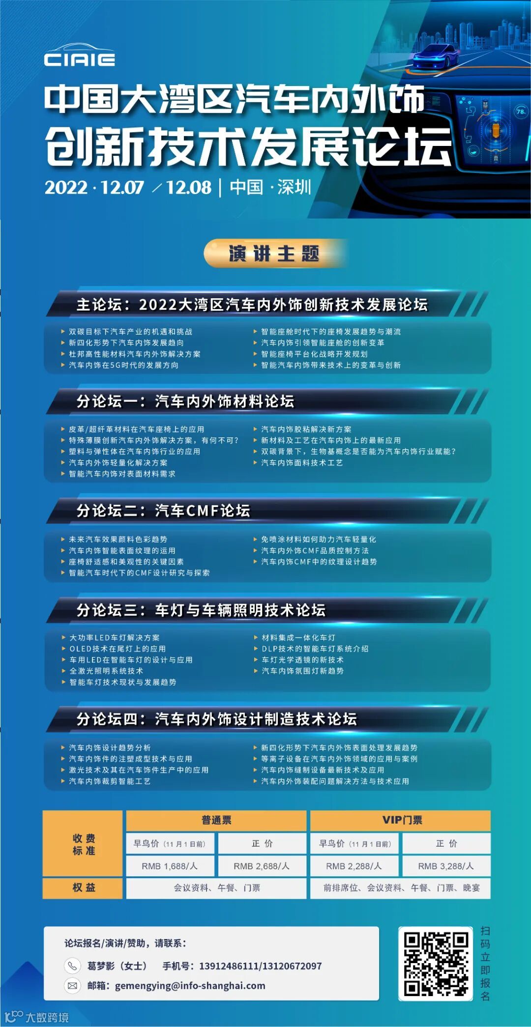 展望汽车内饰的未来,内外饰以简洁、高效、舒适、科技感、智能化的标志元素为新观点,智能创新未来,2022中国大湾区汽车内外饰创新技术发展论坛引领汽车内外饰创新发展潮流的风向标,邀约全球汽车内外饰零部件制造商、服务商、配套商及主机厂、研发、设计、采购工程师、行业专家积极报名。