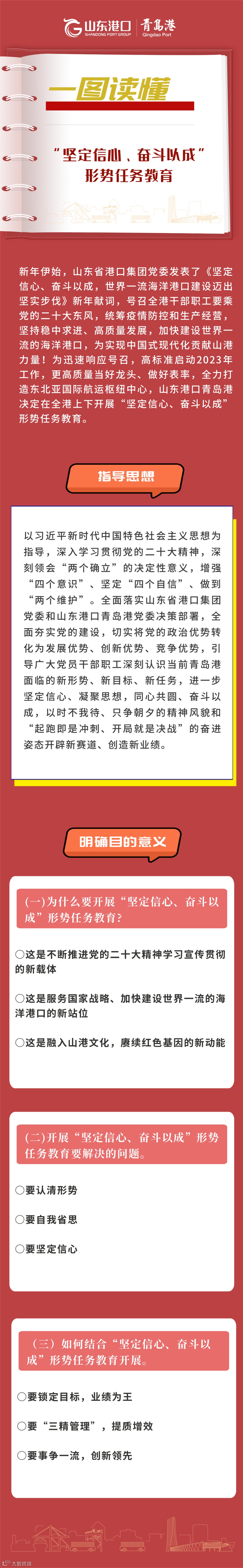 通过此次形势任务教育,我为自己在毕业后就成为了一名山东港口职工而感到荣幸和自豪。2023年是全面贯彻落实党的二十大精神的开局之年,新的历史节点上,我将不懈奋斗,做到理论与实践结合、创新与实干相促进,干出自己的优异成绩。